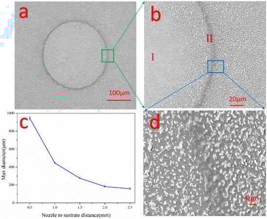 The effect of the distance between the nozzle and the polymer surface was examined firstly. Figure 6a shows SEM images of the microholes on the photoresist etched by plasma microjet. Additionally, Figure 6b illustrates magnified SEM image on the side wall of the microhole fabricated by plasma microjet. Still, some residual photoresist particles remained in the etched region I. Furthermore, the surface on the outside of microholes was decorated with the debris, of which the size was varied from nanometers to micrometers, as shown in Figure 6d. The nonhomogeneous etched region II was owing to the expansion effect of the plasma microjet coming into contact with ambient air. The data in Figure 6c indicated that the maximum diameter of microholes was etched at the closest distance of 0.5 mm, smaller microholes were etched as distance increased. Possible explanations are drawn that when plasma microjet comes into contact with the substrate, ROS will diffuse and move along the surface via gas pressure. Hence, the closer the distance was, the bigger diffusion area it formed, which leads to a bigger etched microhole. Moreover, highly applied voltage and closer distance enhanced the electric field between the silicon and the substrate. Thus, an active plasma region was generated surrounding the plasma microjet, which resulted in an enlarged etched area. Hence, much bigger microholes were etched when the distance was closer than 1 mm.