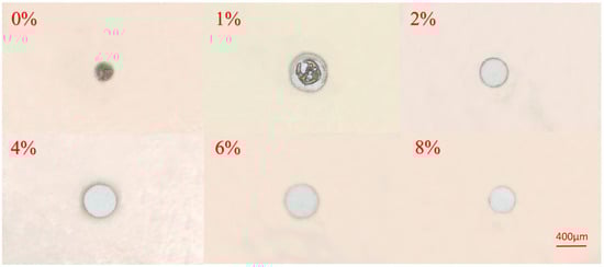 Another important process parameter affecting the diameter of microholes was additive oxygen ratio. Figure 7 shows optical images of etching results in different additive oxygen ratio. It was illustrated that the maximum diameter of microholes was fabricated at the additive oxygen ratio of 4% since the highest intensity of ROS acted as a key reactive species of removing photoresist. It was seen that with the decrease of oxygen flow rate, high temperature, and large amount of high energetic reactive species in the center of the plasma jet accelerated the carbonization and formed a nonhomogeneous and rough zone in the center of microholes []. Additionally, as the additive oxygen ratio increased from 0 to 8%, the diminution of rough and nonhomogeneous etching boundary of etched microholes was seen in Figure 7. This could be explained by that while oxygen admixture produced chemically active species, the physical sputtering delivered nearly no contribution to etching process subsequently []. The additive oxygen acted as electronegative gas, causing the reduction of metastable He, thus eventually weakening the physical sputtering and decreasing the amounts of sputtering fragments at the boundary of microholes [].