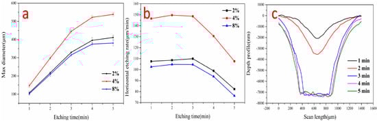 Different etch features can also be fabricated by adjusting the etching time. As shown in Figure 8a, the data of the diameter of microholes varied by etching time under different additive oxygen ratio was shown in Figure 8a. Figure 8b indicated that as the etch time increase, the horizontal etching rate of photoresist increased slightly in the first 3 min, and decreased significantly in subsequent. Indeed, this notable feature was attributed to the weaker reactivity of plasma microjet away from the central axis. Moreover, high intensity of ROS resulted in a stronger etching capability of the plasma microjet, which caused higher etching rate in horizontal of microholes compared the etch result of 2 to 4% and 8%. It is expected that increasing of the etching rate could also be achieved by using higher applied voltage and higher oxygen flow rate [].