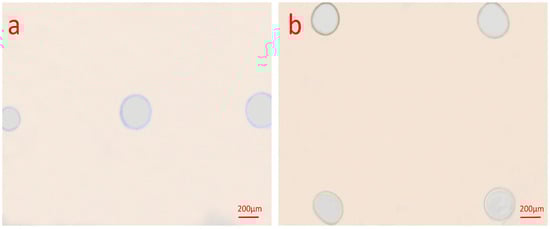(a,b) Optical microscopy images of photoresist etched by plasma microjets array of 1 × 3 and 2 × 2. The diameter of the microholes from left to right in (a) was 196, 251, and 266 μm; diameters in (b) were 251, 268, 253, and 258 μm. Experiment conditions: 700 sccm helium gas and 28 sccm additive oxygen at an applied voltage of 7.5 kVpp and 8.5 kVpp, the frequency was around 11 kHz, the distance was 1 mm.