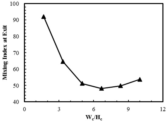 Hc = 8.33 can be attributed to the smaller diffusion distance. The former case shows a comparatively lesser degree of homogenization of species in the mixing region, but higher a degree of mixing near the exit. The slight increase in the mixing index for the aspect ratio values higher than 6.65, can be explained by the fact that an increase in the channel width is accompanied by the increase in the total area of the heterogeneously charged surface at the channel base wall. This results in the relatively lower bulk velocity and slightly higher retention time, and thus the mixing performance is improved slightly.