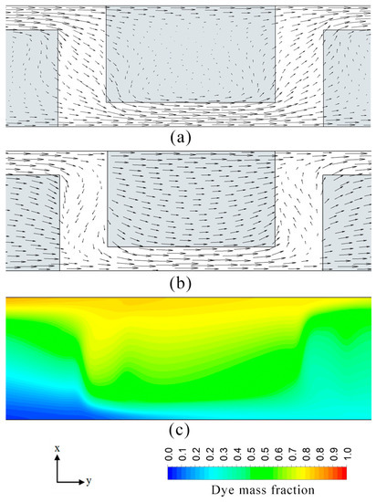 Figure 15. The flow field and dye mass concentration distribution obtained from the simulation for the new design are shown in