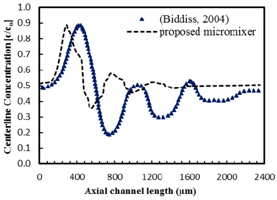 Figure 18, where the proposed design shows rapid homogenization and outperforms the Biddiss’ design by achieving the same level of mixing with a shorter mixing section.