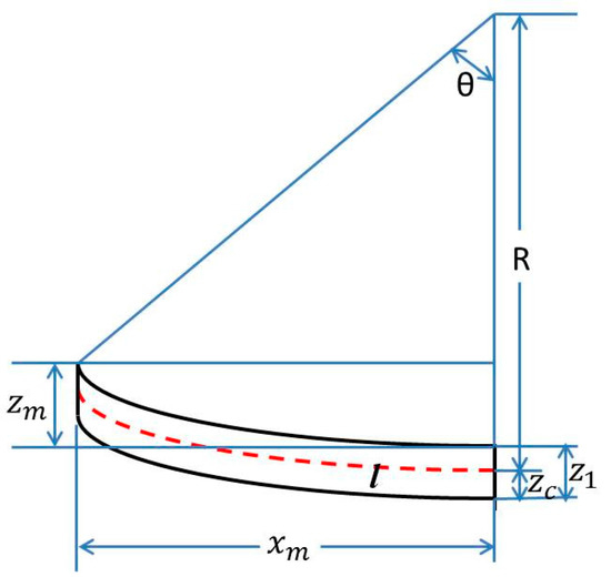 zc is the height of the neutral axis. By solving Equation (7), values of the curvature radius can be obtained accurately. Generally, the maximum deflection of the beam is much smaller than the length of the beam, so