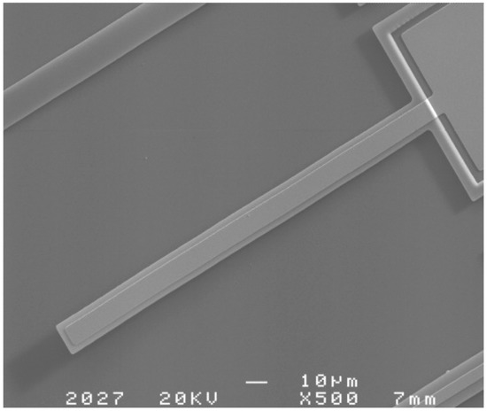Table 4. To avoid the situation that the bottom layer of the cantilever adheres to the substrate, test structures with suitable dimensions should be designed. Simulated by ANSYS (15.0, ANSYS Inc., Pittsburgh, PA, USA), cantilever 1, whose residual stress is −20 MPa in the polysilicon layer and 20 MPa in the metal layer, have a downward deflection of −1.4304 μm. Residual stress of 20 MPa is enough to have a large deflection. Thus, compared to the thickness of the sacrificial layer of 2 μm, cantilevers, whose dimensions are little different from that of cantilever 1, may guarantee a relatively small possibility of substrate adhesion. However, it should be noted that the suitable dimension mentioned above is applicable to the MEMSCAP PolyMUMPS (MEMSCAP Inc., Durham, NC, USA) process and the dimensions of the test structures should be adjusted according to the specific process. In fact, a short time on release, which results when the multilayer cantilevers are relatively narrow, and the relatively large stiffness of multilayer cantilevers, leads to little possibility of adhesion.