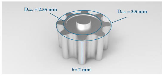 Figure 1 shows the aluminum micro-gear on which the tooling system was developed in this work. The sintered aluminum powder (AVL Metal Powders, Kortrijk, Belgium) was pure at 99.7%, with a fineness ranging from 42 to 250 µm. The gear had a circumscribed and inscribed circle of 3.5 mm and 2.55 mm, respectively. The height of the gear was of approximately 2 mm. The dimensional tolerances were set in the range of 0.005–0.010 mm. Since 2.7 g/cm3 is the assumed aluminum density, the estimated powder weight is 0.038 ± 0.002 g.
