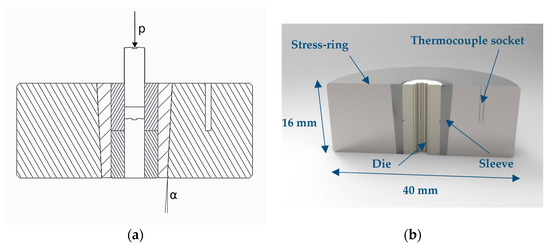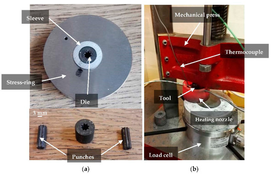 Figure 4 shows the developed tool system and its assembly. The tool system was pre-stressed by assembling the die into the sleeve and mounting both into the stress-ring, as shown in Figure 4a. A mechanical press was used to assemble the tools and generate the required fit. The achieved diameter reduction was measured using the optical microscope and found to agree with the estimated value shown in Table 1 in a range of ±2 µm. After assembling, the whole tool was placed into a heating nozzle (Watlov, St. Louis, MO, USA) as shown in Figure 4b. The sintering process was carried out according to the HIP principle. The ejection force representing the parameter of interest in this work was measured using a load cell, U10M (HBM, Darmstadt, Germany).