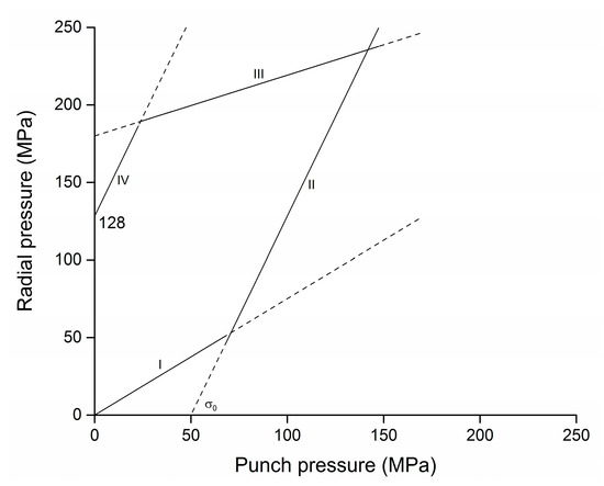 The diagram shows the estimated hysteresis cycle during the axial compaction of the investigated micro-gear according to the Bockstiegel model [15]. The diagram was obtained by assuming an aluminum-steel frictional condition µ = 0.61. Stages: I, elastic loading; II, plastic loading; III, elastic releasing; IV, plastic releasing.