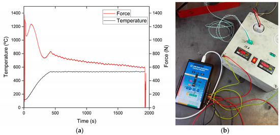 Measuring setup: (a) diagram showing the variation of the main process parameters; (b) data acquisition system, Data-Translation DT-9800 (Data Translation GmbH, Bietigheim-Bissingen, Germany), and temperature control system, Allen-Bradley 900 TC-32 (Rockwell Automation, Milwaukee, WI, USA).