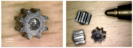 Examples of sintered samples using different process parameters. A pen tip was used to give an idea of the real size of the micro-gears.
