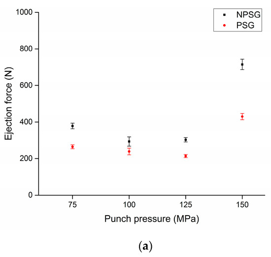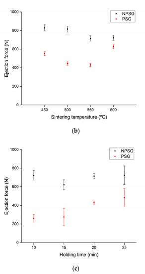 Figure 6 shows an example of gears produced using the developed tool system. Figure 7a–c show the evolution of the measured ejection force under different testing conditions. The three series of experimental results were obtained with the punch pressure, sintering temperature and holding time varying once at a time. Each force value was expressed in terms of the average value and expanded measurement uncertainty. By comparing the ejection forces measured between NPSGs and PSGs, it was seen that a strong reduction of the ejection force was achieved for all the considered sintering sensations. The reduction of the ejection force was found to be several times larger than the expanded uncertainty of the ejection force measurements, giving evidence that the reduction had a physical fundament and, thus, can be replicated over the time.