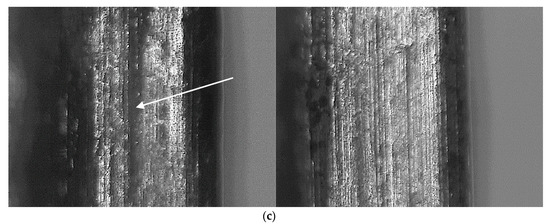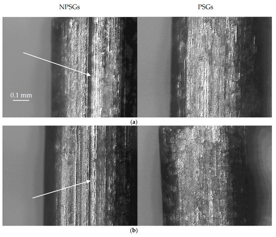 The pictures showing the lateral surfaces of NPSGs, left side, and PSGs, right side, acquired using an optical microscope. PSGs: (a) T: 550 °C, holding time: 10 min, punch pressure: 150 MPa, percentage force reduction: −66%; (b) T: 550 °C, holding time: 15 min, punch pressure: 150 MPa, percentage force reduction: −64%; and (c) T: 550 °C, holding time: 15 min, punch pressure: 150 MPa, percentage force reduction: −30%. Regardless of the sintering process parameters, NPSGs show on their surfaces the consequences of the larger ejections.