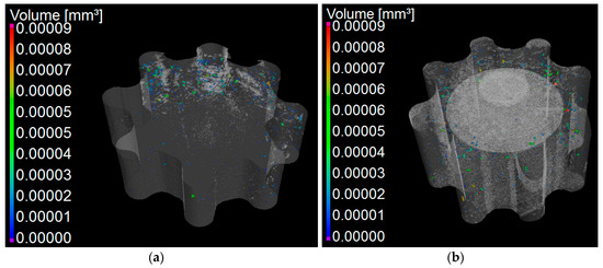 The porosity analysis was performed using two representative 3D volumes, one volume per gear, to minimize the impact of external influences such as dust, image noise, and lubricant. The representative 3D volumes were set to enclose approximately 90% of the total volume of each gear. It was, therefore, assumed that any result obtained from the inspection of the two volumes was representative of the two entire gears. By using the Procedure for Uncertainty MAnagement (PUMA) method [37], the expanded measurement uncertainty, at 95% confidence level, for the porosity analysis was estimated to be equal to ±0.01 mm3. The expanded measurement uncertainty was based on the following uncertainty contributions: (i) the uncertainty from the calibration certificates of the off-line reference artefact; (ii) the uncertainty from the measurement repeatability; and (iii) the uncertainty arising from the image noise. All the uncertainty contributions were based on Type B evaluations [37]. The image noise contributed 60% of the expanded measurement uncertainty. Figure 9 shows the spatial porosity distribution for the two gears inspected using CT. The porosity fraction was quantified to be 0.03 ± 0.01% and 0.05 ± 0.01% of the representative volume for PSG and NPSG, respectively. By performing a t-test [40], it was found that the two porosity distributions can be assumed to be statistically different, leading to a conclusion that the pre-stress increased the compactness of the powder of which the gears were composed. The t-test was conducted at the 95% confidence level and took into account the measurement uncertainty of the porosity fractions. It was also observed that the pores were found to be distributed within the volumes of both selected gears in a different fashion. PSG showed a uniform porosity within the inspected volume, whereas NPSG did not. As a general conclusion, the use of pre-stress reduced the gear porosity by 40% and allowed the achievement of a more uniform spatial distribution of the pores in the gear.