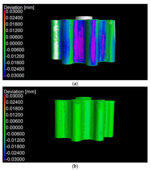 The dimensional analysis of the gears was based on the actual-to-nominal comparison tool [40]. The use of the actual-to-nominal comparison allows the quantification of the deviation of each surface point of an object compared to its CAD file [36]. An actual-to-nominal comparison simplifies the measurement procedures compared to other approaches involving primitive features [36]. By using the PUMA method [37], the expanded measurement uncertainty per voxel was calculated, making each point of an actual-to-nominal comparison traceable to the meter. The measurement uncertainty was based on the following uncertainty contributions: (i) the uncertainty from the calibration certificates of the two used off-line reference artifacts; (ii) the uncertainty from the measurement repeatability; (iii) the uncertainty arising from the image noise; and (iv) uncertainty from the post-processing activities. The expanded measurement uncertainty was found to be 0.003 mm for all the voxels of the reconstructed volumes. A single uncertainty value was sufficient in this case due to the following favorable conditions: (i) no gear movements occurred during scanning, establishing that no local reconstruction errors occurred; (ii) the absence of material-related image artifacts, ensuring that X-rays were well modelled during reconstruction at any voxel; (iii) the axial symmetry of the gears, making sure that scatter and the X-ray absorption coefficient did not change locally. The measurement uncertainty per voxel represents a source of novelty, paving the way for 3D measurement uncertainty estimations. Figure 10 shows the two actual-to-nominal comparisons for the two gears with the deviation range and colors. It can be seen from the figures that the two gears appeared to be extremely different, with PSG having the higher fidelity to the CAD file. PSG showed 95% of its surface lied within ±0.009 mm, whereas PSG showed that 95% of its surface lies within ±0.040 mm. By using a t-test [40], it was confirmed that the two fidelity values were statistically different. As a general conclusion, the adoption of a pre-stress value can improve the dimensional accuracy of gear by more than 75% compared to gears produced without pre-stress.