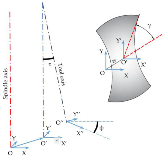 As described in [28], from a geometric point of view, tool run-out can be summarized by four parameters (see Figure 1). Two parameters define the axis offset, namely, offset distance or run-out length (r0) and offset or run-out angle (γ0); the other two parameters define the axis tilt, namely, tilt angle (τ) and the location angle of the tilt angle (ϕ).