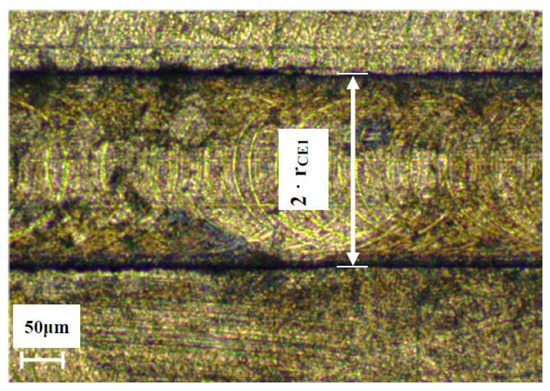 The measurement of the actual tool diameter (d) and the rotational radius of the first cutting edge (rCE1) are quite easy. The actual tool diameter can be directly measured from the tool. When realizing channels, the rotational radius of the first cutting edge can be measured from the channel width, which corresponds to two times the rotational radius of the first cutting edge, as shown in Figure 4. Several instruments are available to get these kinds of measurements, including: microscopes, coordinate vision-measuring machines, interferometers, capacitive sensors, and laser sensors.