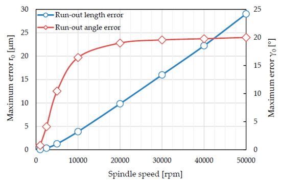 The results of the sensitivity analysis are reported in Figure 7. The maximum measuring errors of tool run-out length and angle decrease as the spindle speed decreases. In particular, the run-out length error shows a linear trend; while the run-out angle error is quite constant for spindle speeds higher than 10,000 rpm, it shows a rapid drop for spindle speed lower than 10,000 rpm.
