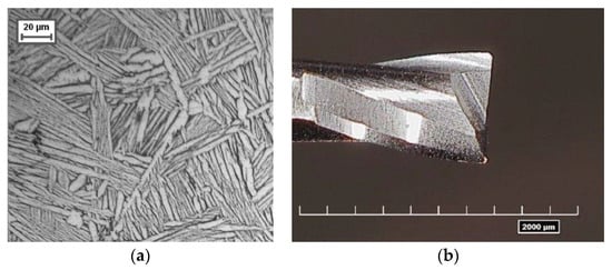 (a) Widmanstätten microstructure of Ti6Al4V sample; (b) Micro end mill (SECO-JM905L008-MEGA-T).