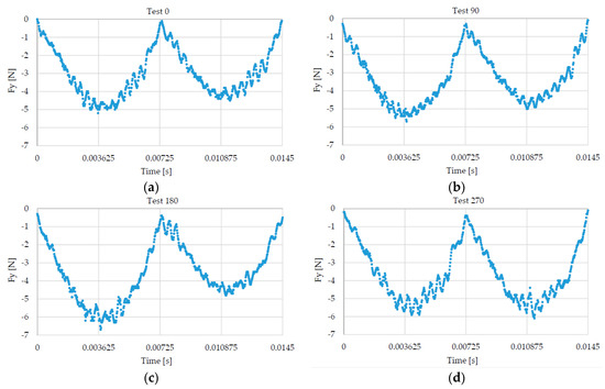 An easy strategy was used to have different run-out conditions under the same cutting conditions. The same tool was used for realizing all the tests. At the end of each cut, the tool holder was unmounted from the spindle to check the tool wear and ensure that the tool wear did not affect the cutting force signal. Due to the low cutting length, no evidence of tool wear was highlighted during these control phases. In particular, the cutting edge radius was monitored to guarantee the shear-cutting regime during the experiments. In fact, an excessive increase of the cutting edge radius can change the cutting regime from shearing to ploughing. The conducted measures confirmed that the cutting edge radius was constant (4 μm) during all the tests. Then, the tool holder, rotated ninety degrees, was mounted on the spindle and a new channel was produced. In this manner, the tool run-out randomly changes for each test. Four channels were made applying this procedure, obtaining four different run-out conditions (i.e., Test 0, Test 90, Test 180, and Test 270). Figure 9 shows the cutting force signal measured along the Y-axis for each test; the higher tool run-out is noticeable for Test 180 (Figure 9c), the lower for Test 270 (Figure 9d).
