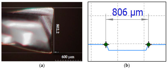 As mentioned previously, the tool diameter was measured by using a Hirox RH-2000 confocal microscope (Figure 11a); while the width of the four channels was estimated as an average value of measurements, using a Mitaka PF-60 laser probe in four different positions along the channels’ length. An example of output of the microchannel profile given by the Mitaka PF-60 measuring system is shown in Figure 11b. Table 4 summarizes the measuring results.