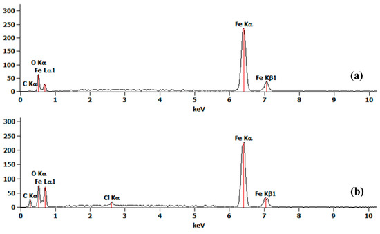 Energy-dispersive X-ray spectroscopy (EDS) was utilized to analyze elements of the produced superhydrophobic surface. EDS spectra of the ball surface, before and after oxidation (Figure 3a,b), indicate Fe, C, and O are the main elements, with more O after oxidation. Stronger peaks of Fe and O in Figure 3b reveal that the atomic ratio is 1:1.25. The element category and ratio satisfy the inference that the ingredients of the oxidation products is Fe3O4, pure Fe, with small amount of Fe2O3 and FeO. To further study the crystal structure of the Fe oxides, X-ray diffraction (XRD) measurement is conducted and the XRD pattern of the oxidation nanosheet is as shown in Figure 3c, which matches with the standard XRD pattern of Fe3O4. The result indicates that the main ingredient of oxidation is Fe3O4.