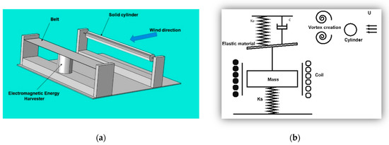 In energy harvesting, a vortex is generated by placing a cylinder to disturb the fluid flow. The fluid flow pressure exerts a force on the membrane strip, which causes the belt to deform, thereby inducing mechanical stress on the electromagnetic energy harvester. The mechanical vibration causes a charge in the electromagnetic harvester, which is then used by the harvester circuit.