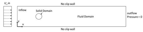 The dependent variables for this solution domain include pressure p and the fluid particle velocity vector u = {u, v, w}T, where the u, v, and w are the components of velocity, x, y, and z are the Cartesian directions. To simplify the problem, the fluid flow is assumed to be laminar and Newtonian, and the constant air density is 1 kg/m3. In this study, 2D simulations were conducted using COMSOL Multiphysics (COMSOL Inc., Stockholm, Sweden) to predict the Karman vortex creation behind the solid cylinder during flow.