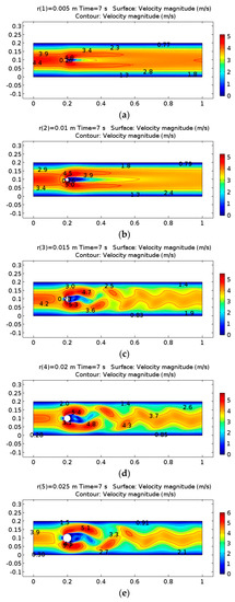 Development of fluid velocity contour demonstrating von Karman vortex streets behind a bluff body. (a) Diameter = 1 cm; (b) Diameter = 2 cm; (c) Diameter = 3 cm; (d) Diameter = 4 cm; (e) Diameter = 5 cm.