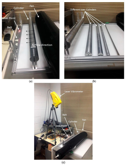 (a) Measurement point at the center of the belt and airflow direction. (b) Different sizes of cylinders. (c) Laser Vibrometer.