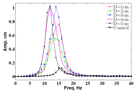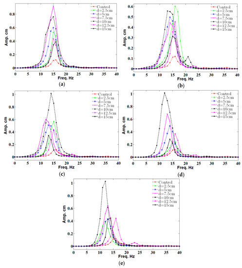 In Figure 6, the maximum amplitude, which represents the resonance, of the fluttering belt without a cylinder (control) has the minimum value for all distances between the cylinder and belt compared with all the diameters of the cylinder. The maximum amplitude of almost 1 cm occurred for the cylinder diameters of 3, 4, and 5 cm with a distance of 10 cm, as shown in Figure 6c–e, respectively. However, the fluttering frequency was minimal in a large diameter.