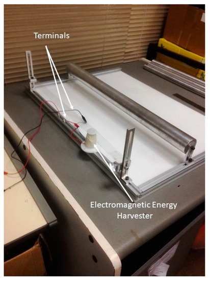The applications of electromagnetic energy harvesting from structural deformations and vibrations have been intensively developed in the last decade [10,11]. Recent research in energy harvesting by electromagnetic induction has focused primarily on harvesting energy from the mechanical vibration of structures, to which the harvester is attached using the broadband effects [12,13,14]. Some of these researches demonstrated a significant enhancement of the harvested power and the frequency bandwidth of a multimodal vibration energy harvester consisting of arrays of coupled levitated magnets [15,16] when the device is excited beyond its critical Duffing amplitude [17,18]; this is due to magnetic nonlinearity and modal interactions [19].