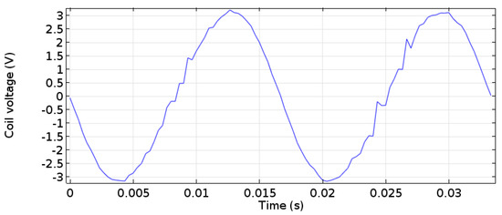 From the simulations and experiments, the optimum parameters were used with the electromagnetic energy harvester placed near the long end to harvest the energy. The parameters are 10 cm for the cylinder distance from the belt, which provides the belt a high amplitude, and 3 cm for the diameter of the cylinder, which is near to the shedding frequency (Figure 8). In this work, only the open-circuit voltage was measured, and no resistive circuit or load was applied given that the objective of this work is to investigate the feasibility of vortex creation and flutter in harvesting energy. The result for the coil voltage peak-to-peak was 6 V, as shown in Figure 9 for 5000 turns of the copper coil and neodymium (NdFeB) cylindrical magnets.