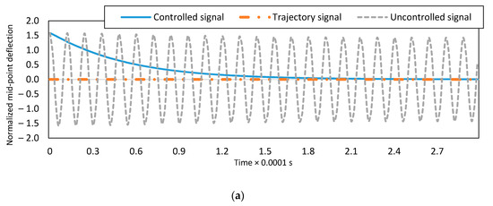 The effect of the impulse is investigated in Figure 8c,d. The dynamic response of the uncontrolled system and the controlled system for C-C boundary conditions is shown in Figure 8c. The value of impulse is , which is applied at . The higher values of impact lead to unacceptable deflections. The proposed active vibration control algorithm could absorb the vibration due to the impulse and initial conditions. Figure 8c depicts the dynamic response of the controlled system when the impulse value is , and the desired signal is equal to zero. The boundary conditions are C-C, and the error of the initial estimates of the dimensionless parameters is 10%. The supplied voltages of the two electrodes for the controlled system are demonstrated in Figure 8d. As shown in Figure 8d, the controlled system could compensate for the effect of impulse by regulating the applied voltages of the electrodes instantly.