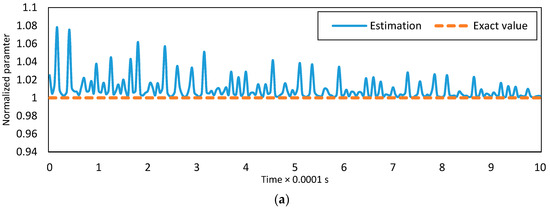 The adaptive projection law is updating estimates of the unknown dimensionless parameters. The estimates belong to the known closed sets at all times. If the desired signal has enough dissimilar frequencies, the estimates will converge to exact values [54]. The necessary number of frequencies can be found by analyzing the complexity of the system. In the case of this paper, the desired signal should have seven or more dissimilar frequencies such that the estimates of parameters converge to exact values. This is a result of studying the results of various simulations. It should also be mentioned that the measure of unmodeled forces would affect the convergence rate. The estimations of , and are plotted for the C-F boundary conditions in Figure 6 to show how the adaptive projection law operates.