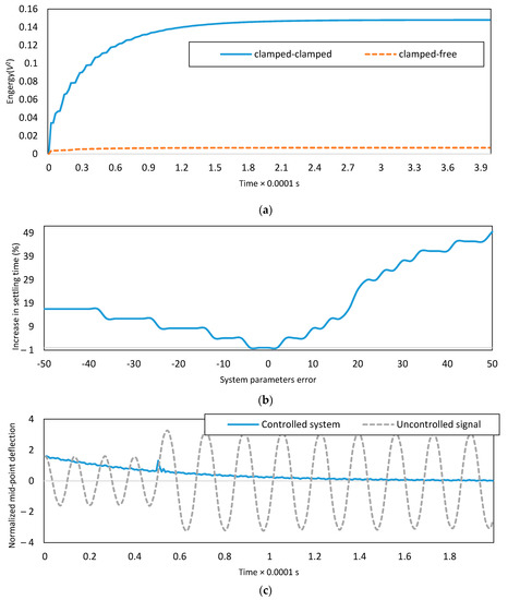 (a) Applied energy for tracking zero desired path; (b) increase in the settling time due to uncertainties in the system parameters; (c) the dynamic response of the clamped-clamped micro-switch subjected to an impulse; and (d) supply voltage of two electrodes under the effect of an impulse.