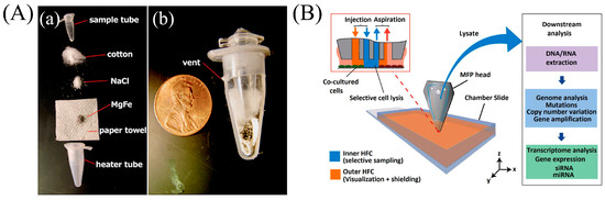 Chemical lysis. (A) Chemical heater: (a) exploded view of heater tube, paper towel with MgFe, NaCl, and cotton. Water was added to trigger heating. (b) Assembled sectional view of heater. Adapted from [35] with permission of The Royal Society of Chemistry (B) Selective lysis of cells: Illustration of a microfluidic probe head skim through cells, the interaction of biochemicals with the cells (inset). Reprinted from [40] with permission of Nature Publishing Group, Copyright 2016.