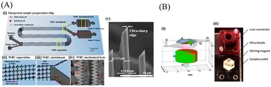 Mechanical lysis. (A) Integrated WBC enrichment and lysis: (i) a schematic illustration of WBC separation and mechanical lysis; (ii) lateral displacement of WBCs; (iii) self-enrichment of WBCs by controlling the width ratio between two outlets; (iv) WBCs are simultaneously ruptured by mechanical nanoblade arrays; (v) Magnified image of ultra-sharp edge. Reprinted from [45] with permission of Nature Publishing Group, Copyright 2015. (B) Bead beating mechanical lysis device: (i) Schematic of components: (1) inlet, (2) outlet, (3) stirring magnet, (4) zirconia/silica beads, (5) bead weir, (6) rotating magnet, and (7) electric motor coupling; (ii) Digital Image of lysis device. Reproduced from [25] with permission of The Royal Society of Chemistry.