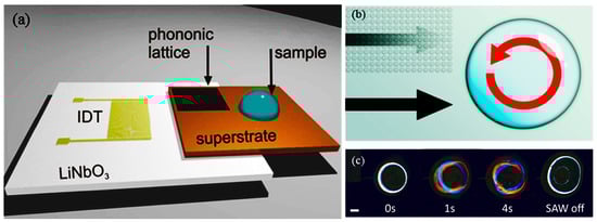 Surface acoustic wave (SAW) stage used to lyse cells: (a) interdigitated transducer (IDT) used to generate the SAW; (b) the phononic lattice absorbs SAWs in a frequency-dependent manner. This acts to create a rotational movement within the droplet and results in shear flows that contribute to the disruption of the cell membrane. (c) The sequence of images shows a droplet of cells undergoing SAW-induced mechanical lysis. Reprinted with permission from [53]. Copyright (2015) American Chemical Society.