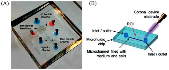Electrical lysis: (A) electrical lysis using nanoporous membrane; Reproduced with permission from [60]. (B) Schematic of the experimental setup using corona discharge. Reproduced from [61] with permission of The Royal Society of Chemistry.