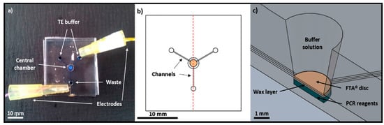 (a) Microfluidic device used to perform integrated DNA purification and amplification experiments; (b) schematic top view of the channels and central chamber; (c) schematic cross section view of FTA® paper discs placed on top of a layer of wax-encapsulated PCR. Reproduced with permission from [80].