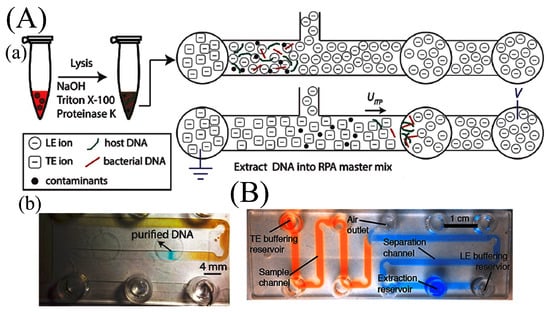Microfluidic isotachophoresis device. (A) Schematic of ITP compatible lysis: (a) schematic of electric field configuration for ITP; (b) ITP extraction process in chip. Purification and separation of DNA from whole blood contaminants. Adapted from [70] with permission of The Royal Society of Chemistry. (B) Microfluidic device to improve extraction efficiency. Reprinted from [91]. Copyright (2014), with permission from Elsevier.