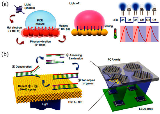 Several researchers showed the potential for fast thermal control through optical heating methods. Roux et al. [104], Pak et al. [105], Lounsbury et al. [106], Liu et al. [107], and Hagan et al. [72] used infrared (IR)-mediated heating for RT-PCR amplification to reduce amplification time. In a representative example from Hagan, the analysis time for RNA-based influenza A virus decreased 5-fold (to 39 min). Son et al. [108] achieved thermal ramping from 55 °C (annealing) to 95 °C (denaturation) within 5 min by employing thin Au films that convert incident LED light into heat through plasmon-assisted optical absorption (Figure 7). Phaneuf et al. [109] presented thermal multiplexing for multiplexed PCR using a laser diode, a single radiative heat source that is selectively modulated for temperature control in an array of PCR reactions. The system is able to generate different annealing temperatures in a single microchip suitable for simultaneous amplification 500 bp and 600 bp amplicons. The amplification of λ-phage (annealing at 68 °C for 500 bp) and EBV template (annealing at 48 °C for 600 bp) DNA is performed in 110 min.