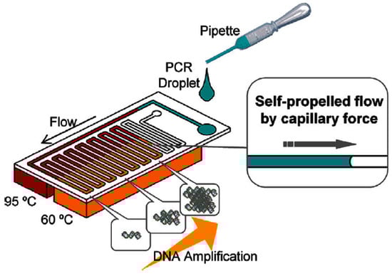 Schematics of self-propelled CF-PCR microfluidic device. The PCR solution is dropped and automatically transported by capillary forces. Reproduced with permission from [123]. Copyright (2015), with permission from Elsevier.