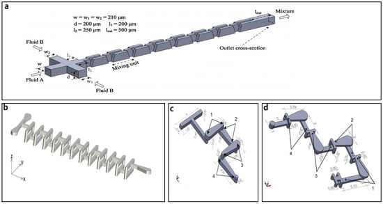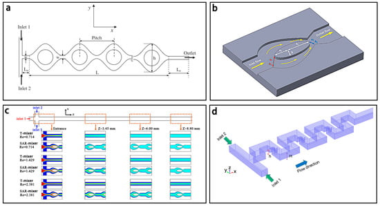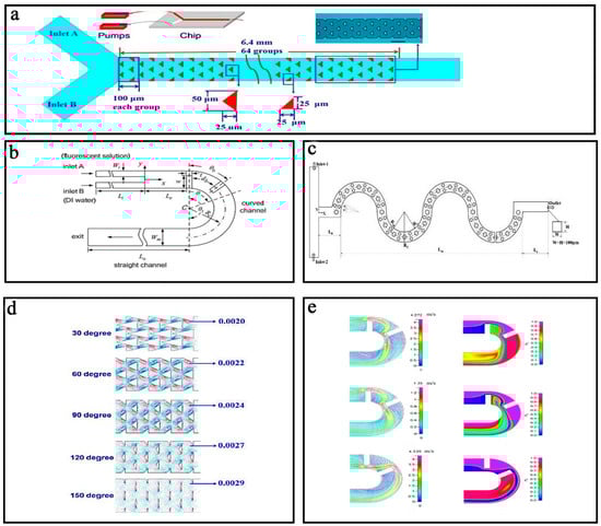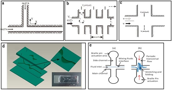 The pressure field driven micromixers often have simple structures and consist of a main channel with a side channel (Figure 1a) [64], a main channel with multiple side channels (Figure 1b) [65], or two cross channels (Figure 1c) [66].
