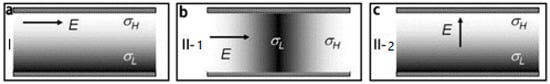 Typical base states for electro-kinetics with type I (a); type II-1 (b); and type II-2 (c). E and the arrow indicate the electric field and its direction, respectively; and indicate high- and low- conductivity regions, respectively. Reproduced with permission from [72].