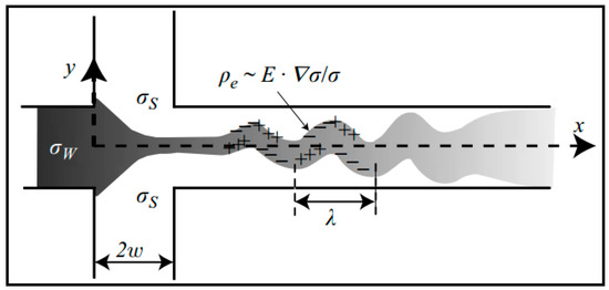 Schematic of the unstable flow in a cross-shaped microchannel with the characteristic D-shape and cross-sections of isotropic etching. σs is the ionic conductivity of the sheath streams from top and bottom inlets. σw is the ionic conductivity of the sample stream from the left inlet. Pe, E, λ, and w are charge density, electric field, nominal wavelength and half-width of channel, respectively. Reproduced with permission from [19].