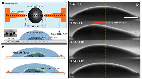 Another typical electrical field driven micromixer with liquid metal was described by Tang et al. [73]. Due to their former concept of surface tension driven flow [74], this micromixer used the same Galinstan cap (semi-spherical) placed on a circular copper substrate seat as the core of a liquid metal actuator to induce chaotic advection (Figure 4a). Under a sinusoidal AC electric field (4 V, 50 Hz to 150 Hz), periodic deformation of the Galinstan cap could be observed due to the tangential force, which pulls the surrounding liquid along the surface from the regions of low surface tension (LST) to the regions of high surface tension (HST) (Figure 4b,c). The time averaged mixing efficiency could reach 95% at the flow rate of 25 µL/min when the 4 V & 50 Hz signal was applied.