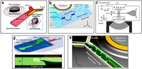 Some other bubble-based sound micromixers have also been reported. Ozcelik et al. [38] utilized the surface roughness of the polydimethylsiloxane (PDMS) microchannel’s sidewalls to cavitate the bubbles and obtained excellent mixing efficiency (92%) for high-viscosity fluids at a low Reynolds number of 0.01 in less than 100 ms. Wang et al. [80] presented another bubble based micromixer, which was made up of a 300 μm thick dry adhesive layer sandwiched between two 2-mm-thick polymethylmethacrylate layers. A nozzle-shaped chamber with an acoustic resonator profile was developed in the adhesive layer for generating the bubbles in the microchannel when the piezo-electric disk under the chamber was actuated at the frequency range of 1–5 kHz. Besides, nitrogen gas was reported for generating bubbles to develop bubble based micromixers. As shown in Figure 5b, the nitrogen gas was injected in the center of two reagents in the microchannel and microstreaming was generated for mixing these two reagents [43]. The proposed micromixer could mix two highly viscous fluids (95.9 mPa·s) in the presence of an acoustic field within 50 ms with an excellent mixing efficiency of ~93% at a low Re number (~0.01).