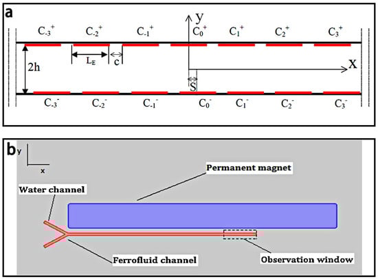 (a) Schematic of the magneto-hydrodynamic micromixer. LE is the width of the electrodes, c is the width of the space between two adjacent electrodes, S is the offset of two facing elecrodes, and 2h is the width of the conduit; (b) Schematic of the ferrofluid-based magnetic micromixer with Y-shaped channel. Reproduced with permission from [57,83].