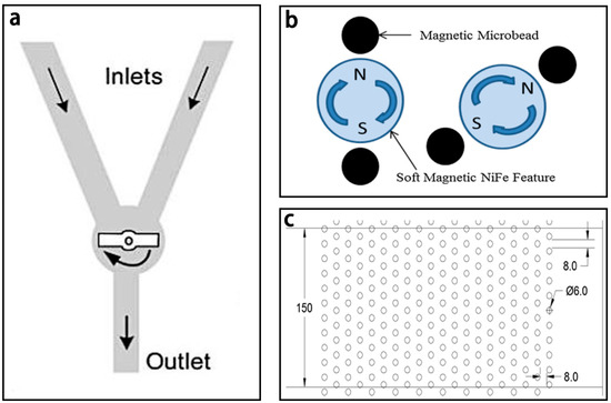 (a) Schematic of the magnetic stirring micromixer; (b) Schematic of the magnetic microbeads attracted to the poles of the NiFe feature; (c) Schematic of the microfluidic channel with its floor patterned with NiFe features. Reproduced with permission from [54,84].